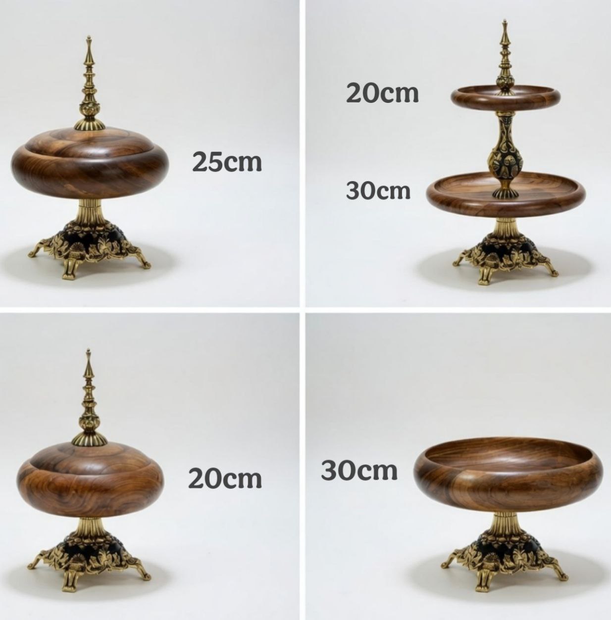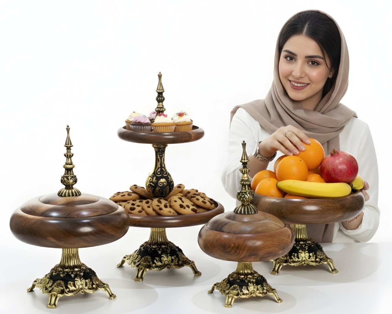 دستهبندی: سرویس پذیراییجنس: چوب گردوآیتم ها: میوه خوری،شیرینی خوری ۲طبقه،آجیل خوری درب دار،شکلات خوری دربدارابعاد: در تصویر